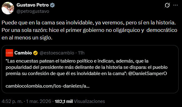 «Puede que en la cama sea inolvidable, ya veremos, pero sí en la historia. Por una sola razón: hice el primer gobierno no oligárquico y democrático en al menos un siglo», escribió el mandatario en su cuenta de X al comentar el sondeo divulgado este domingo.