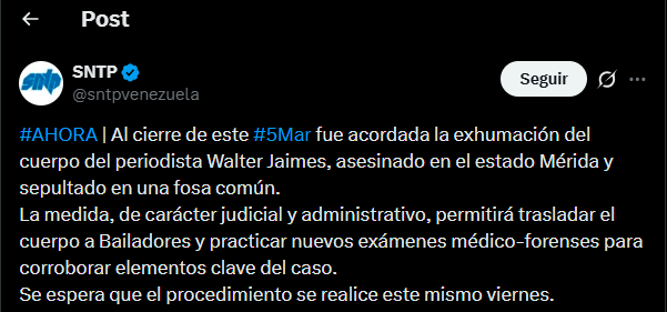 De acuerdo con el reporte difundido por el gremio en su cuenta oficial de X, la medida —de carácter judicial y administrativo— permitirá trasladar el cuerpo hasta la población de Bailadores y practicar nuevos exámenes médico-forenses para corroborar elementos clave dentro de la investigación del crimen.