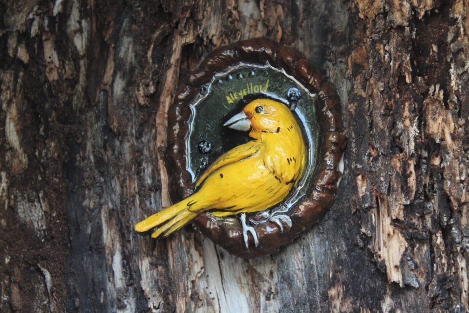 Este jilguero dorado o canario criollo es una de las seis piezas que Alejandra, también conocida como Aleyellow, instaló en distintas partes de las ciudades de Valencia (Carabobo) y Caracas con la intención de poner su granito de arena para el embellecimiento de los espacios. Esta iniciativa comenzó en la urbanización donde reside su abuela en Valencia.