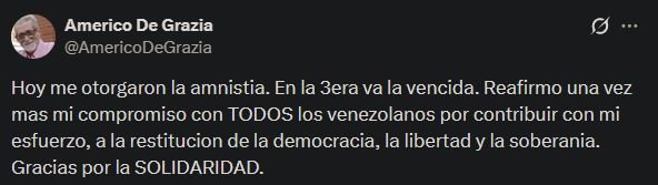 El dirigente y expreso político venezolano, Américo De Grazia, anunció este lunes que le fue concedida la libertad plena en el marco de los procesos de la Ley de Amnistía, y reafirmó su compromiso de trabajar por la restitución de la democracia y la soberanía en el país.