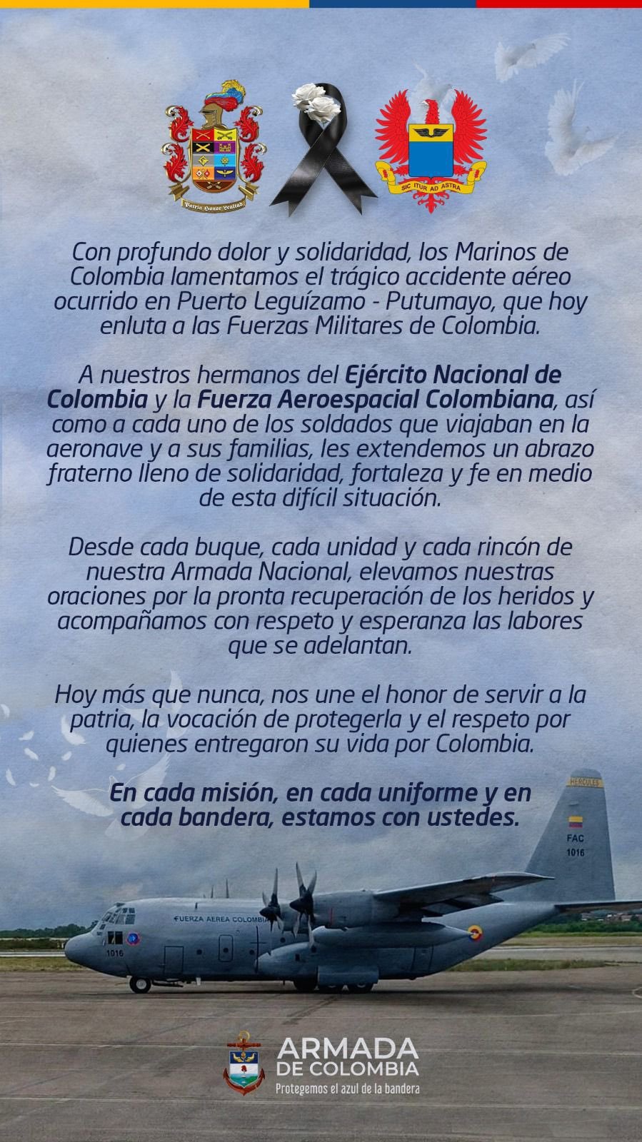 “Acompañamos a las familias de los héroes de la patria, víctimas de este lamentable accidente aéreo”, señaló la Armada, que además aseguró que mantiene oraciones por la recuperación de los heridos y reiteró su respaldo a las operaciones que continúan en la zona.
