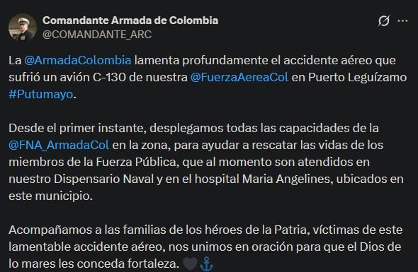 La Armada de Colombia expresó este lunes su “profundo dolor” por el siniestro del avión Hércules C-130 de la Fuerza Aérea Colombiana ocurrido en Puerto Leguízamo, en el departamento del Putumayo, y aseguró que acompaña a las familias de las víctimas mientras apoya las labores de rescate en la zona.