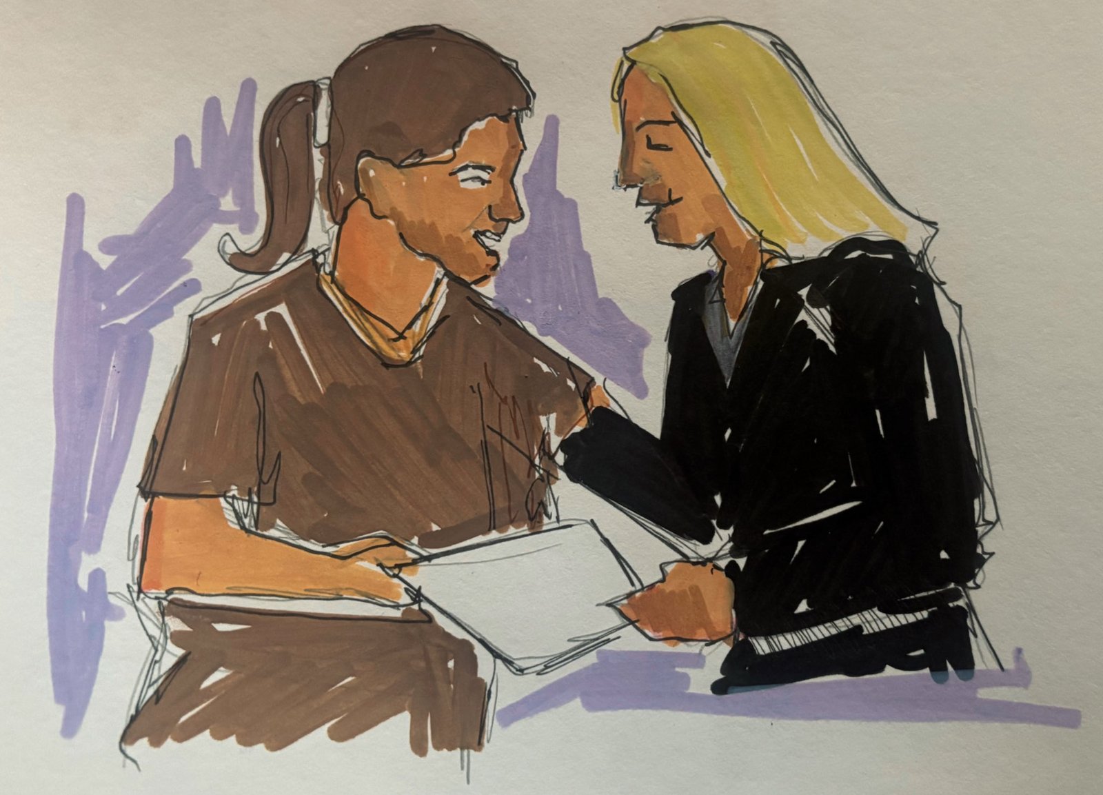 Otro boceto captura un momento de diálogo entre Flores y una mujer rubia, quien parece ser una abogada o asistente legal. Flores con auriculares y camisa marrón conversa sobre un documento, mientras la abogada con traje negro se inclina hacia ella.