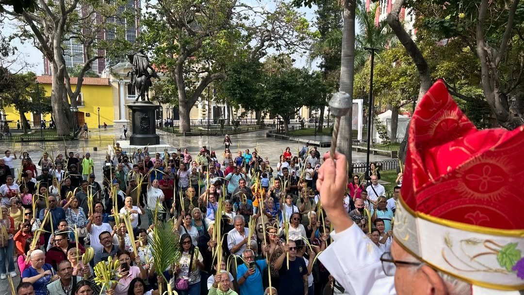 Decenas de feligreses se congregaron desde temprano en la Plaza Bolívar, en el centro de Caracas, donde la tradición religiosa se inició con un acto público en el que Biord lideró la bendición de los ramos que se distribuyen durante la misa.