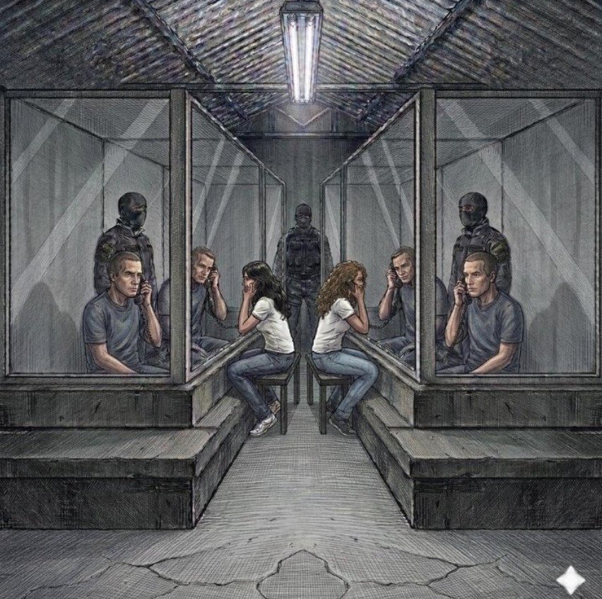 Una vez ahí, los familiares entran y se sientan. Los separa un vidrio grueso del otro lado, donde se sientan los presos políticos, a los que traen encapuchados y esposados. Hasta que el custodio no da la orden, nadie puede hablar.