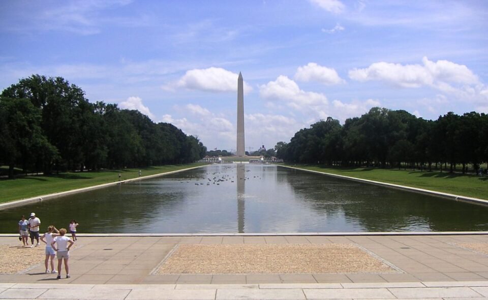 Vista desde el «Memorial a Lincoln» del «Reflecting Pool» con el «Monumento a Washington» al fondo.