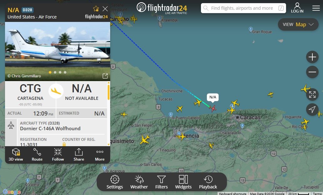 Un avión militar perteneciente a la Fuerza Aérea de Estados Unidos aterrizó en el aeropuerto Internacional de Maiquetía este jueves 26 de marzo. La plataforma de rastreo Flightradar24 confirmó la llegada de la aeronave a la principal terminal aérea de Venezuela tras su trayecto sobre el mar Caribe.