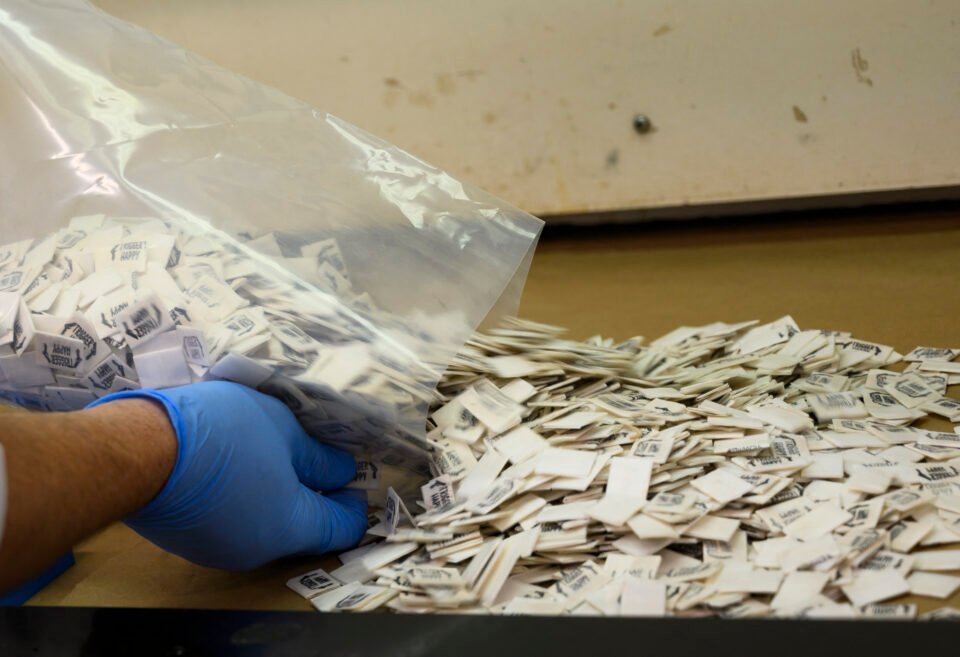 Un químico de la Administración de Control de Drogas (DEA) vierte 2500 paquetes de fentanilo. (Foto de Don EMMERT / AFP)