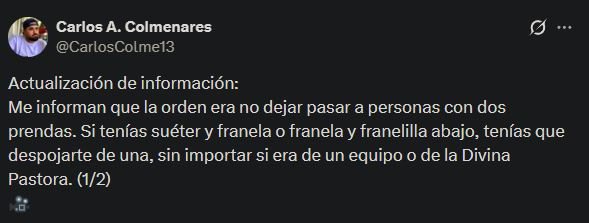De acuerdo con varios reportes del periodista Carlos Colmenares en su cuenta de X, los señalamientos apuntaron a que el personal de seguridad en los accesos al recinto impidió el ingreso de personas, incluidos niños, que portaban más de una prenda superior —como franelas, suéteres o franelillas— obligándolos a despojarse de alguna de ellas sin garantía de recuperación posterior.