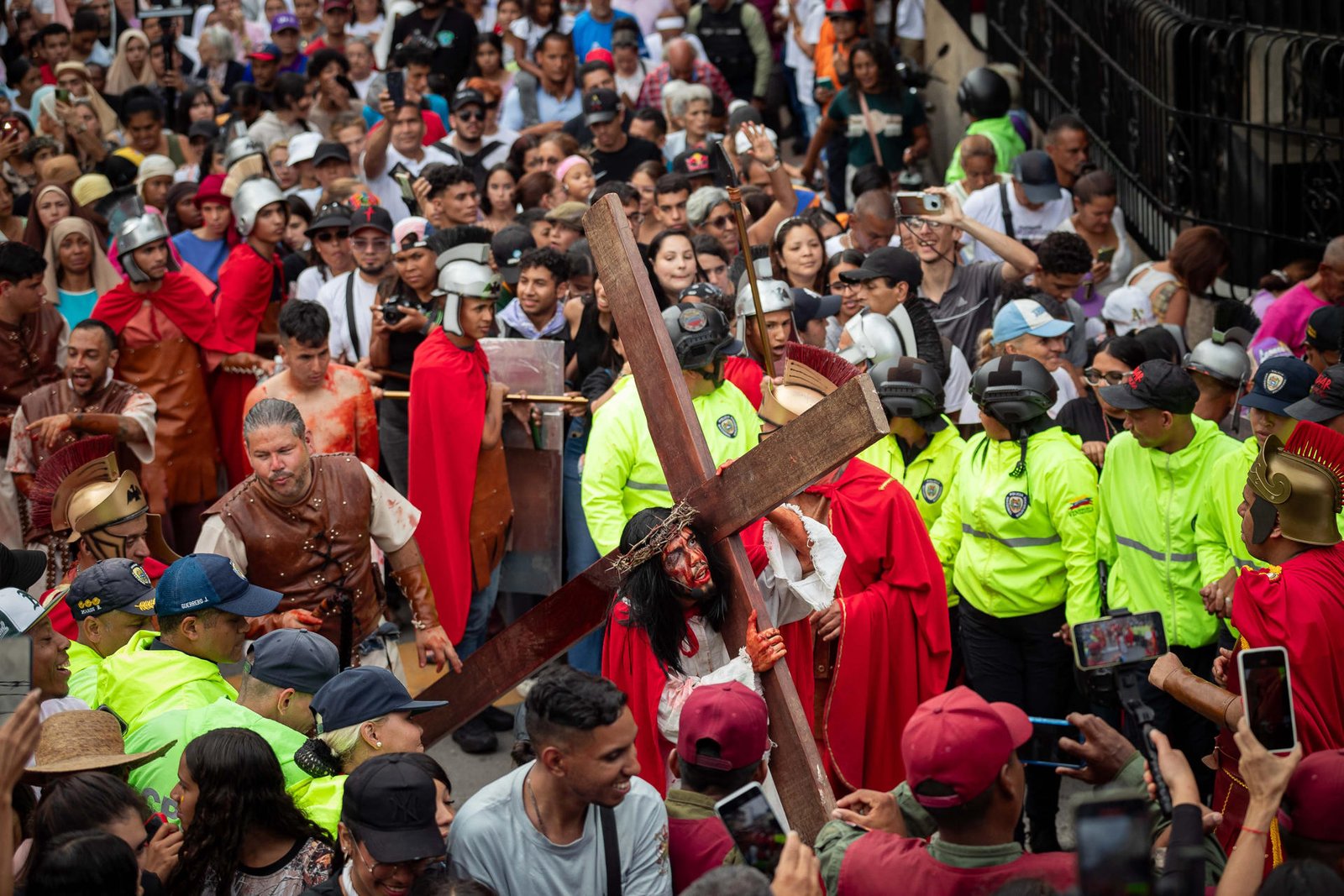 Por las calles de la barriada caraqueña, un grupo de actores jóvenes -residentes de esta comunidad- representaron los últimos momentos de Cristo, narrados en la Biblia, ante la mirada de cientos de personas que se conmovieron con la actuación de los personajes.