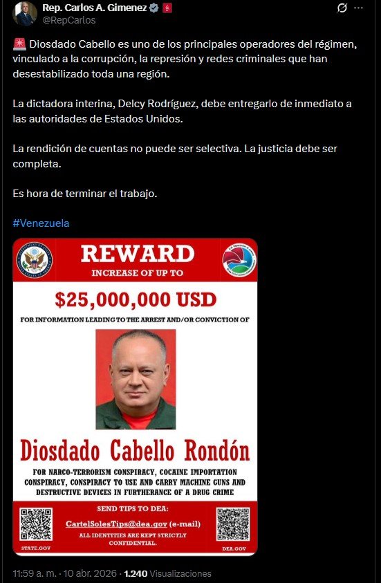 El congresista republicano Carlos Giménez elevó la presión este viernes sobre uno de los principales rostros del chavismo, al exigir públicamente que Diosdado Cabello sea entregado a las autoridades de Estados Unidos, en un mensaje difundido a través de su cuenta en la red social X.