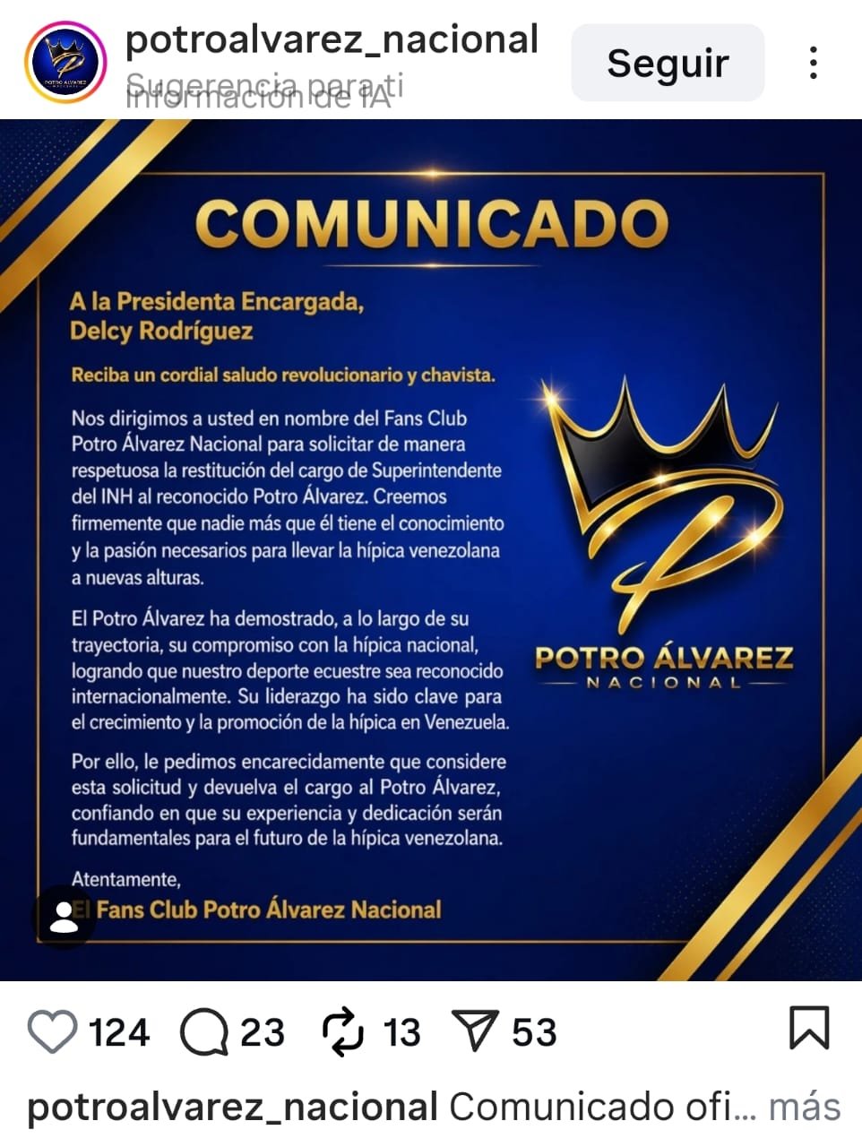 Un grupo de seguidores hípicos desplegó una campaña en las últimas horas para suplicarle a la sucesora de Nicolás Maduro, Delcy Rodríguez, que mantenga al exbeisbolista Antonio «El Potro» Álvarez al frente del Instituto Nacional de Hipódromos (INH), a pesar del oscuro historial que arrastra su gestión.