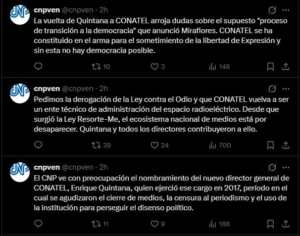 “El CNP ve con preocupación el nombramiento del nuevo director general de Conatel, Enrique Quintana, quien ejerció ese cargo en 2017, período en el cual se agudizaron el cierre de medios, la censura al periodismo y el uso de la institución para perseguir el disenso político”, indicó la organización gremial.