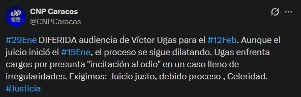 A través de una publicación en su cuenta de X, el gremio denunció que el proceso, iniciado el pasado 15 de enero, continúa dilatándose. Asimismo, recordó que Ugas enfrenta cargos por presunta “incitación al odio”, en un caso que —según el CNP— presenta múltiples irregularidades.