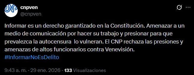 “El CNP rechaza las presiones y amenazas de altos funcionarios contra Venevisión”, escribió la organización en su pronunciamiento, en el que reafirma que la libertad de información y expresión está protegida por la Constitución y no puede ser limitada por coacciones.