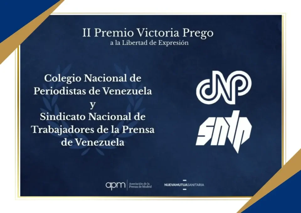 El jurado del Premio Victoria Prego a la Libertad de Expresión, reunido ayer, 13 de abril, en la sede de la Asociación de la Prensa de Madrid (APM), ha otorgado al Colegio Nacional de Periodistas de Venezuela (CNP) y al Sindicato Nacional de Trabajadores de la Prensa de Venezuela (SNTP) el galardón que distingue la trayectoria y/o acciones de personas, empresas, organismos o instituciones en defensa de la libertad de expresión y del libre ejercicio del periodismo.