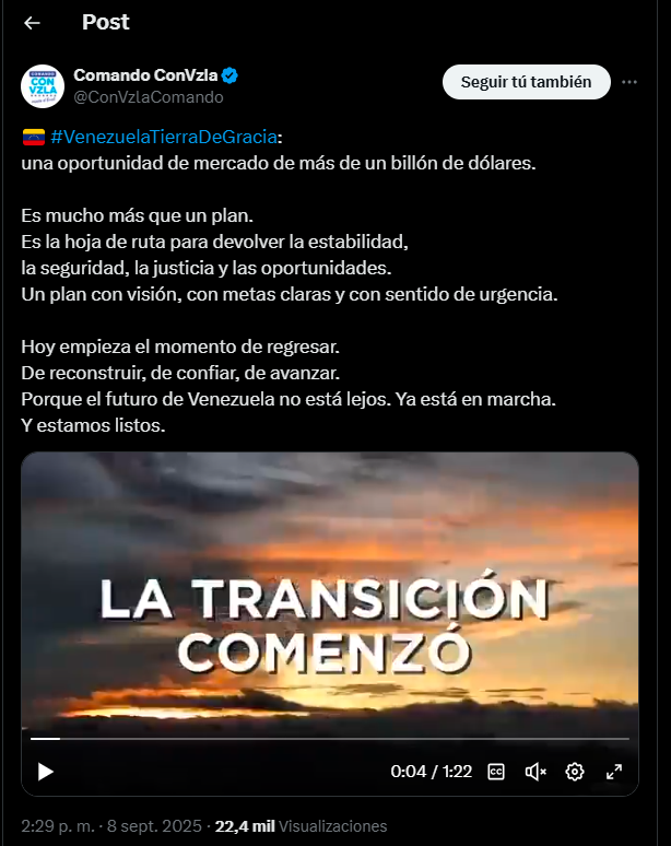 El mensaje estuvo acompañado por un video titulado “Hablemos de lo que ya está en marcha”, en el que se reitera que la transición ya comenzó y que existe un plan diseñado para los primeros 100 días de un eventual nuevo gobierno, con medidas para superar la emergencia humanitaria, recuperar la economía y garantizar el respeto a la Constitución.