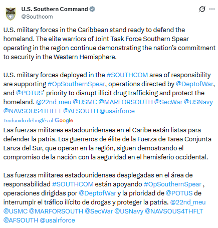 El Comando Sur de los Estados Unidos reafirmó la disposición de sus fuerzas militares en el Caribe para garantizar su seguridad nacional y la estabilidad del hemisferio occidental.