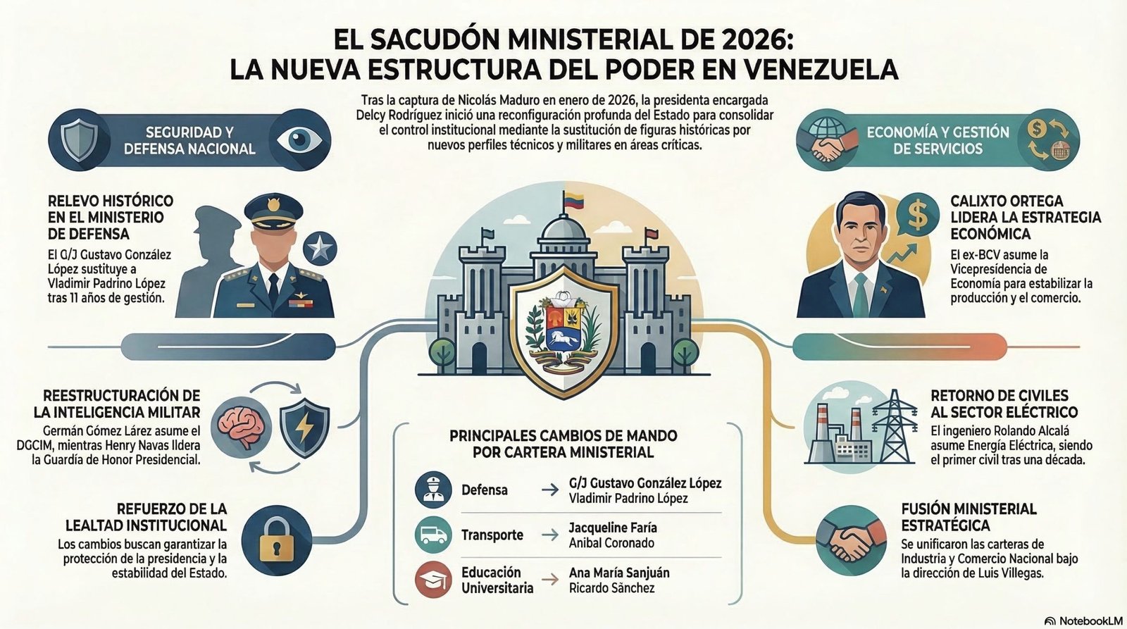 Tras la captura de Nicolás Maduro el 3 de enero de 2026, Delcy Rodríguez asumió la presidencia encargada y ha ejecutado una reestructuración profunda del gabinete ministerial en varias etapas, enfocándose en áreas de defensa, servicios públicos y economía.