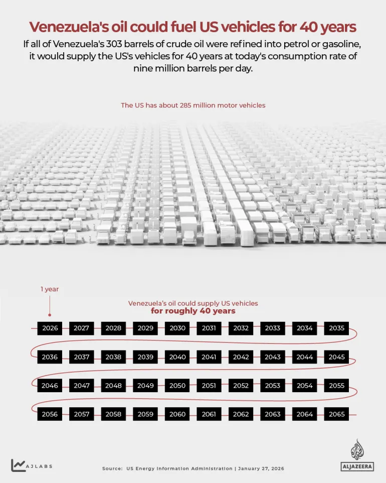 Si escalamos esto al consumo nacional de EE. UU. —que consume casi 9 millones de barriles de gasolina al día—, el crudo de Venezuela podría abastecer a los vehículos estadounidenses durante aproximadamente 40 años al ritmo de consumo actual.