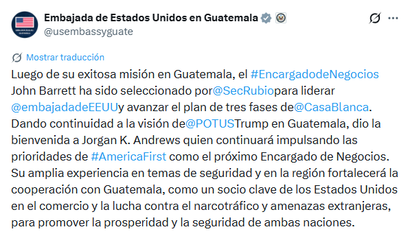 La representación diplomática en Guatemala confirmó que el representante recibió la instrucción de «liderar la Embajada en Venezuela y avanzar el plan de tres fases de la Casa Blanca». Esta designación asegura la permanencia de los objetivos de seguridad nacional establecidos por el gobierno de Donald Trump para el territorio venezolano en la etapa de transición actual.
