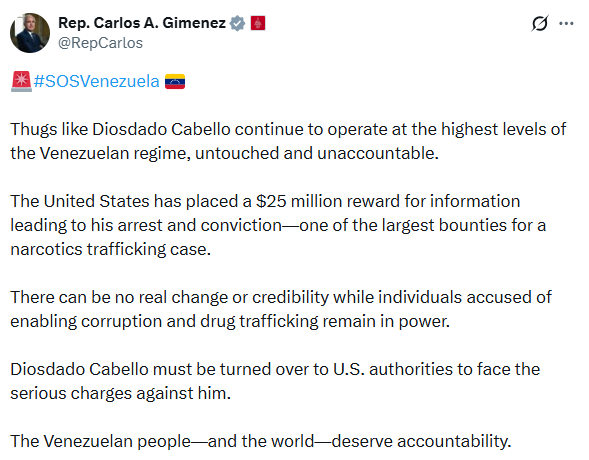 “Matones como Diosdado Cabello siguen operando en los niveles más altos del régimen venezolano, impunes y sin rendir cuentas a nadie. Estados Unidos ha ofrecido una recompensa de 25 millones de dólares por información que conduzca a su arresto y condena, una de las mayores recompensas ofrecidas en un caso de narcotráfico”, dice el mensaje de Giménez.