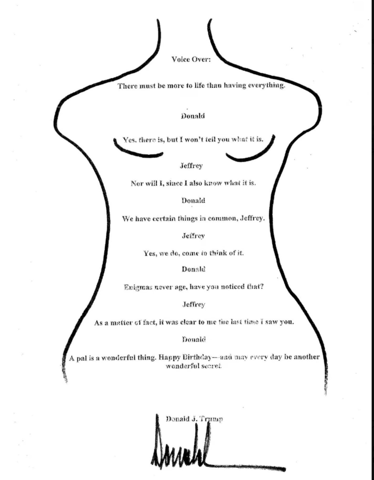 El Congreso de Estados Unidos ha hecho público un dibujo erótico. Un pequeño y críptico guion audiovisual, o algo parecido, escrito dentro de la silueta de un cuerpo desnudo femenino, con explícita alusión al pecho y el vello púbico. De por sí, la noticia es atípica. Si se tiene en cuenta que el autor es el presidente de Estados Unidos, se llega a niveles inimaginables. Pero si la historia se completa con el hecho de que el destinatario, en 2003, era el financiero pederasta Jeffrey Epstein, y que Donald Trump negó y niega vehementemente que ese dibujo exista -e incluso denunció por 10.000 millones de dólares a The Wall Street Journal, el periódico que lo desveló. Se roza el paroxismo.
