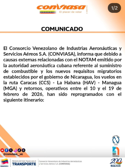 Conviasa emitió un comunicado informando la reprogramación de sus vuelos en la ruta Caracas – La Habana – Managua y sus respectivos retornos, programados originalmente entre el 10 y el 19 de febrero de 2026.