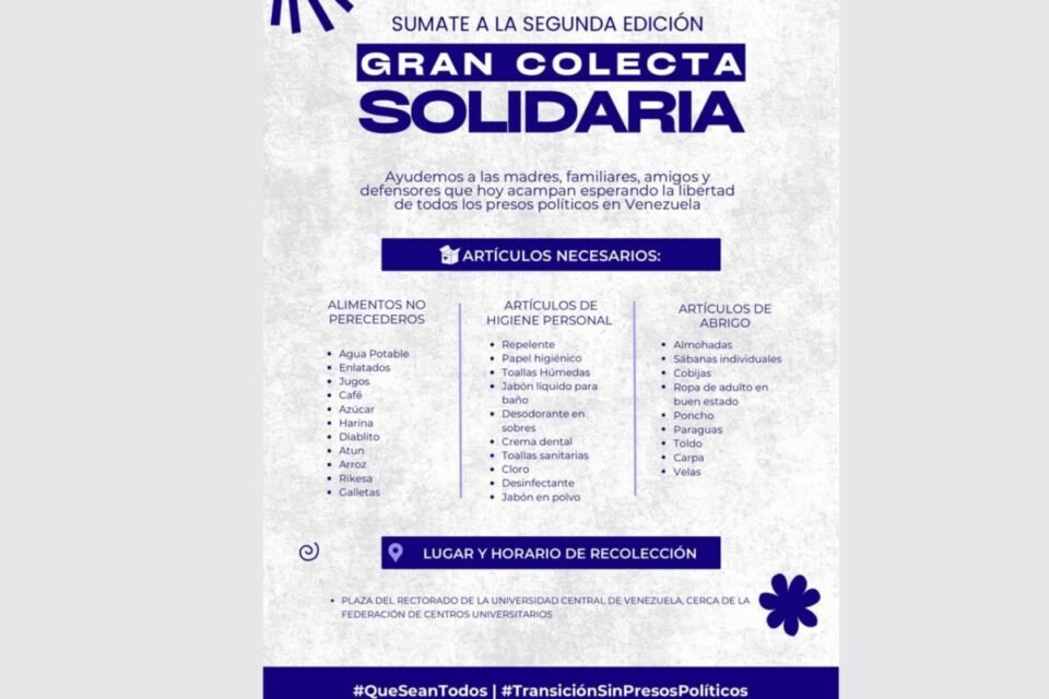 “Madres, familiares, amigos, defensores, estudiantes, trabajadores y venezolanos en general convocamos a una gran jornada de recolección de insumos. Hoy, estas familias sacrifican la comodidad de su hogar como un acto de dignidad y resistencia frente a la injusticia”, señala el mensaje difundido en X.