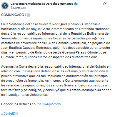 La Corte Interamericana de Derechos Humanos (Corte IDH) notificó este lunes una sentencia en el caso Guevara Rodríguez y otros Vs. Venezuela, en la cual ordena al régimen chavista la inmediata liberación de Juan Bautista Guevara Rodríguez, Rolando de Jesús Guevara Pérez y Otoniel José Guevara Pérez.