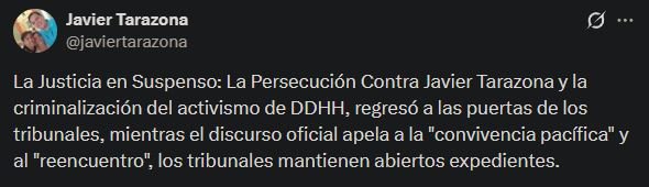 Tarazona también pidió que se dé cumplimiento a la Ley de Amnistía, al señalar que su caso responde a una judicialización por motivos políticos. Asimismo, solicitó que se avance hacia el cierre del proceso y el restablecimiento de sus derechos.