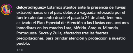 «Estamos atentos ante la presencia de lluvias extraordinarias en el país, debido a vaguada reforzada por el fuerte calentamiento desde el pasado 24 de abril», indicó en un mensaje publicado en Telegram.
