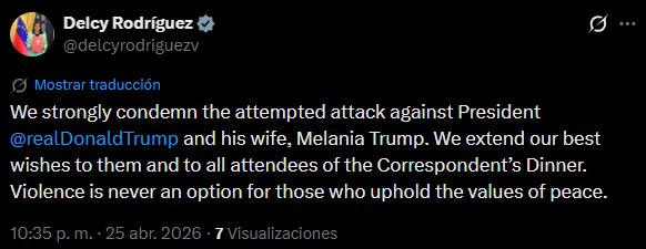 A través de su cuenta en X, Delcy Rodríguez, utilizó el idioma del «imperio» para rechazar el asalto armado ocurrido durante la cena anual de corresponsales de la Casa Blanca. El aparato de propaganda extendió sus «deseos de buena voluntad» tanto al mandatario norteamericano como a la primera dama, Melania Trump.