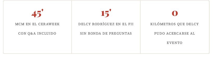 Empezó por el inventario, porque en ese auditorio el inventario importa: Venezuela tiene las mayores reservas de petróleo probadas del mundo —más de300 mil millones de barriles—, la séptima reserva de gas natural, más de 30 de los60 minerales críticos en la lista estratégica del gobierno de Estados Unidos, y una ubicación a cinco días de navegación de los puertos del Golfo. Nada de eso era noticia para nadie en esa sala. Lo que vino después, sí.