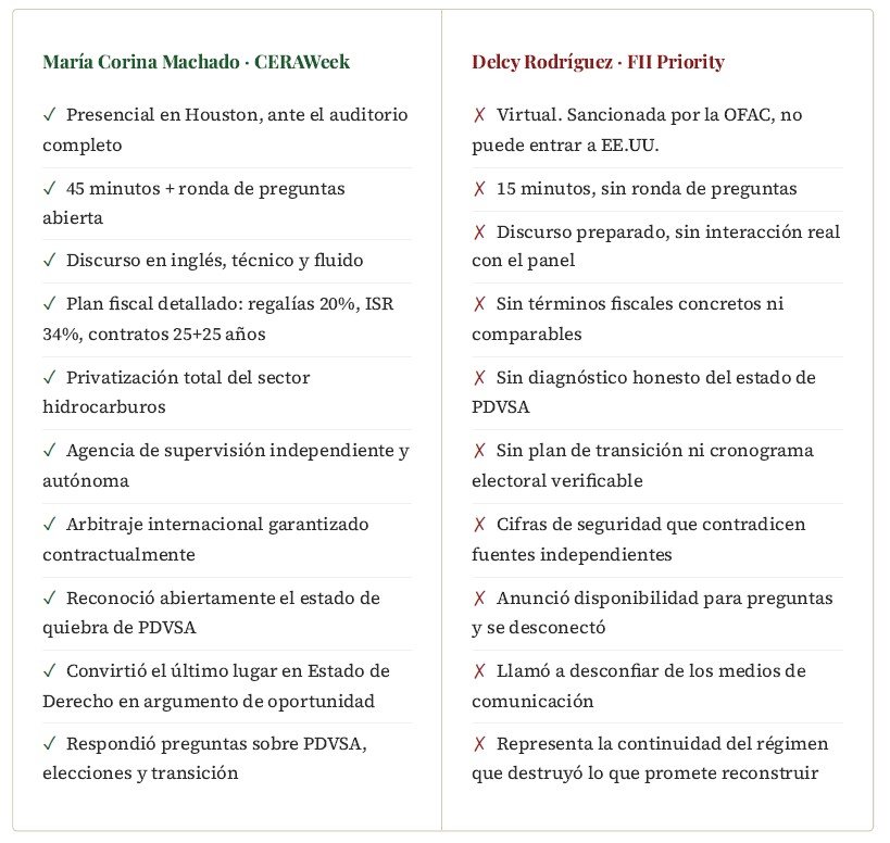 Una lideresa que llega en persona, habla 45 minutos, da números específicos y se que da a responder las preguntas incómodas — sobre PDVSA, sobre el Estado de Derecho, sobre las elecciones, sobre cómo se garantiza que lo prometido se cumpla — envía una señal radicalmente distinta a la de una funcionaria que aparece 15 minutos en pantalla, no puede pisar el país donde se celebra el evento, y se despide antes de que empiece el escrutinio.