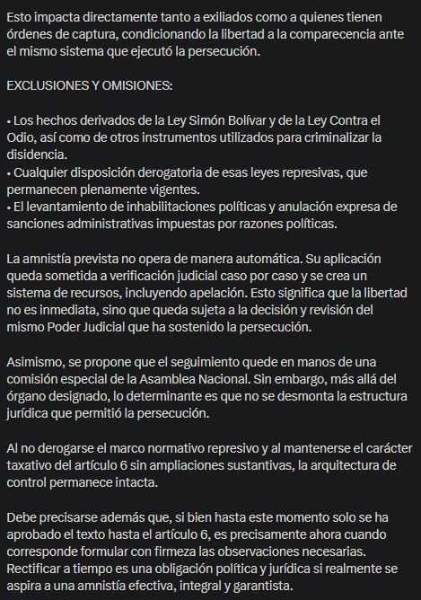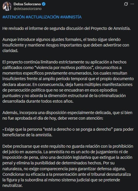 A través de una publicación en su cuenta de X, Solórzano explicó que, aunque el nuevo informe introduce ajustes formales, el texto sigue siendo “insuficiente” y conserva «riesgos importantes» que deben ser considerados. Además, señaló que el proyecto restringe su aplicación a hechos calificados como “violencia por motivos políticos” en momentos específicos previamente enumerados, lo que —a su juicio— excluye múltiples manifestaciones de persecución desarrolladas durante años.