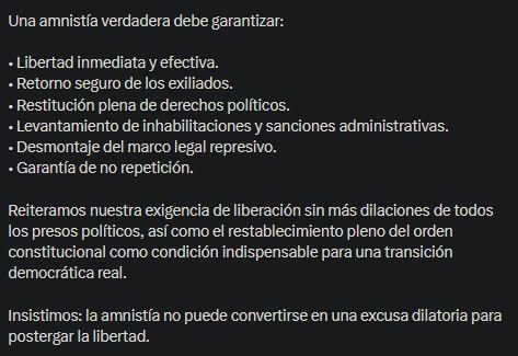 “La amnistía no puede convertirse en una excusa dilatoria para postergar la libertad”, afirmó, al reiterar su exigencia de liberación sin más demoras de todos los presos políticos y el restablecimiento pleno del orden constitucional.