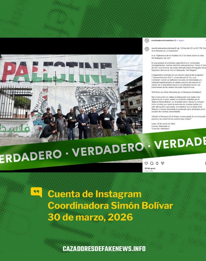 La organización Cazadores de Fake News denunció este domingo 5 de abril, a través de un extenso hilo en su cuenta de X, que el embajador de Irán en Venezuela, Alí Chegeni, se reunió con integrantes de la Coordinadora Simón Bolívar en la parroquia 23 de Enero, en Caracas, y participó en un programa radial donde, según la organización, se hicieron llamados al magnicidio contra Donald Trump y Benjamín Netanyahu.