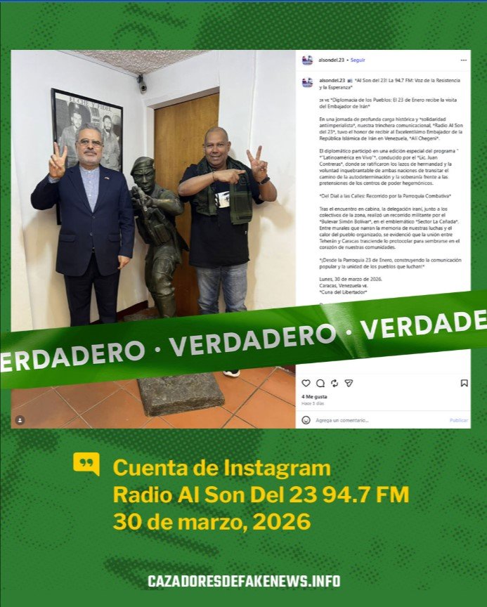 La organización Cazadores de Fake News denunció este domingo 5 de abril, a través de un extenso hilo en su cuenta de X, que el embajador de Irán en Venezuela, Alí Chegeni, se reunió con integrantes de la Coordinadora Simón Bolívar en la parroquia 23 de Enero, en Caracas, y participó en un programa radial donde, según la organización, se hicieron llamados al magnicidio contra Donald Trump y Benjamín Netanyahu.