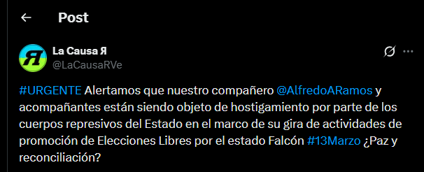 El partido político Causa R utilizó su cuenta oficial en la plataforma X (anteriormente Twitter) para lanzar una alerta internacional.