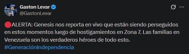 “Alerta: Genesis nos reporta en vivo que están siendo perseguidos en estos momentos luego de hostigamientos en Zona 7. Las familias en Venezuela son los verdaderos héroes de todo esto”, escribió.