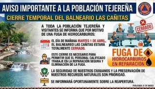 El aviso publicado por Protección Civil señala (aunque con fecha errónea) que este martes el balneario se mantendría cerrado en su totalidad mientras un personal calificado trabaja en la reparación de la fuga y la eliminación de trazos de petróleo en el río.