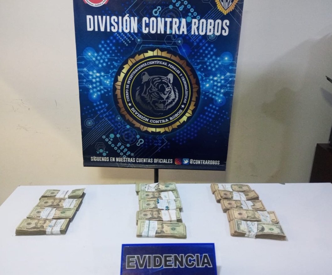 Como evidencias se recuperaron dos motos usadas como medio de comisión, un vehículo, celulares, dos motos compradas con el dinero robado: más de 380 mil dólares en efectivo y más de 290 mil bolívares en efectivo.