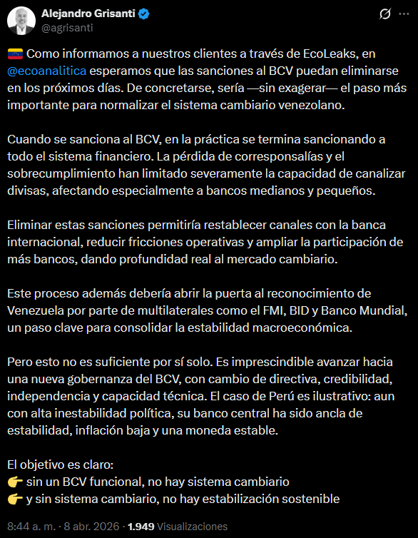 «Esperamos que las sanciones al BCV puedan eliminarse en los próximos días. De concretarse, sería —sin exagerar— el paso más importante para normalizar el sistema cambiario venezolano», pronosticó Grisanti en sus redes sociales.
