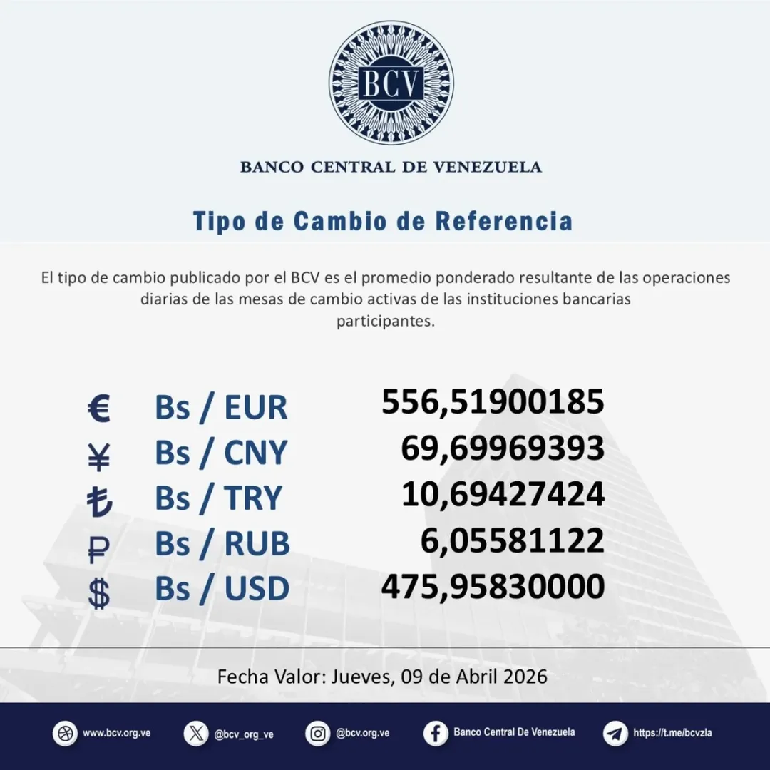 El Banco Central de Venezuela (BCV) anunció este miércoles un nuevo ajuste en el tipo de cambio oficial, vigente hasta el jueves 9 de abril.