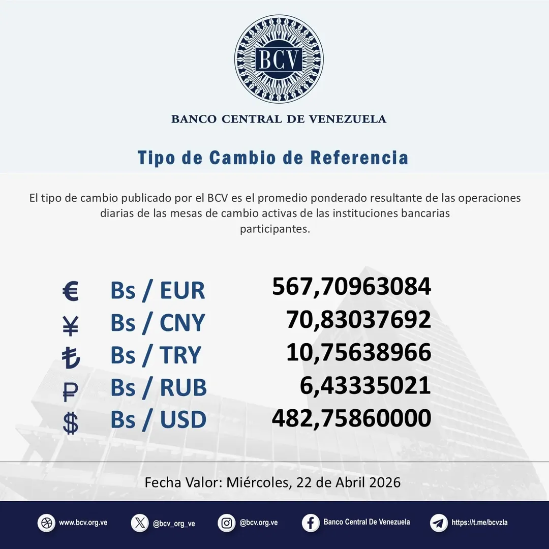 El Banco Central de Venezuela (BCV) anunció este martes un nuevo ajuste en el tipo de cambio oficial, vigente hasta el miércoles 22 de abril.