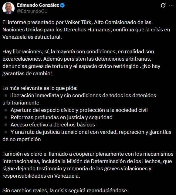 González Urrutia coincidió con el balance de esta oficina de la ONU asegurando, en un mensaje en X, que «confirma que la crisis en Venezuela es estructural».