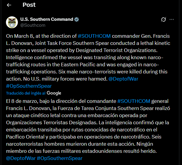 «Inteligencia confirmó que la embarcación estaba transitando a lo largo de conocidas rutas de narcotráfico en el Pacífico del este y estaba involucrada en operaciones de narcotráfico. Seis hombres narcoterroristas murieron en esta acción. Ninguna fuerza militar de EEUU sufrió daños», señaló el Southcom en sus redes sociales.