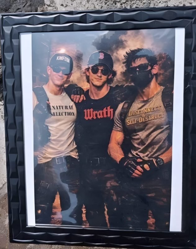 El hombre vestía un cubrebocas y una camisa de cuadros gris; y en la fotografía generada por inteligencia artificial llevaba una playera (camiseta) con la leyenda «Disconnect and Self-Destroy» («Desconecte y autodestrúyase»), una frase vinculada a la True Crime Community (TCC), una subcultura digital global que glorifica a los asesinos de masas.