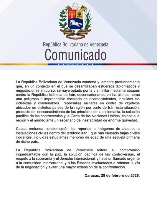 El chavismo emitió un «tibio» comunicado este 28 de febrero para condenar los ataques militares perpetrados contra el régimen iraní.